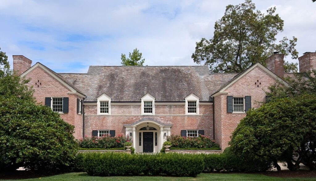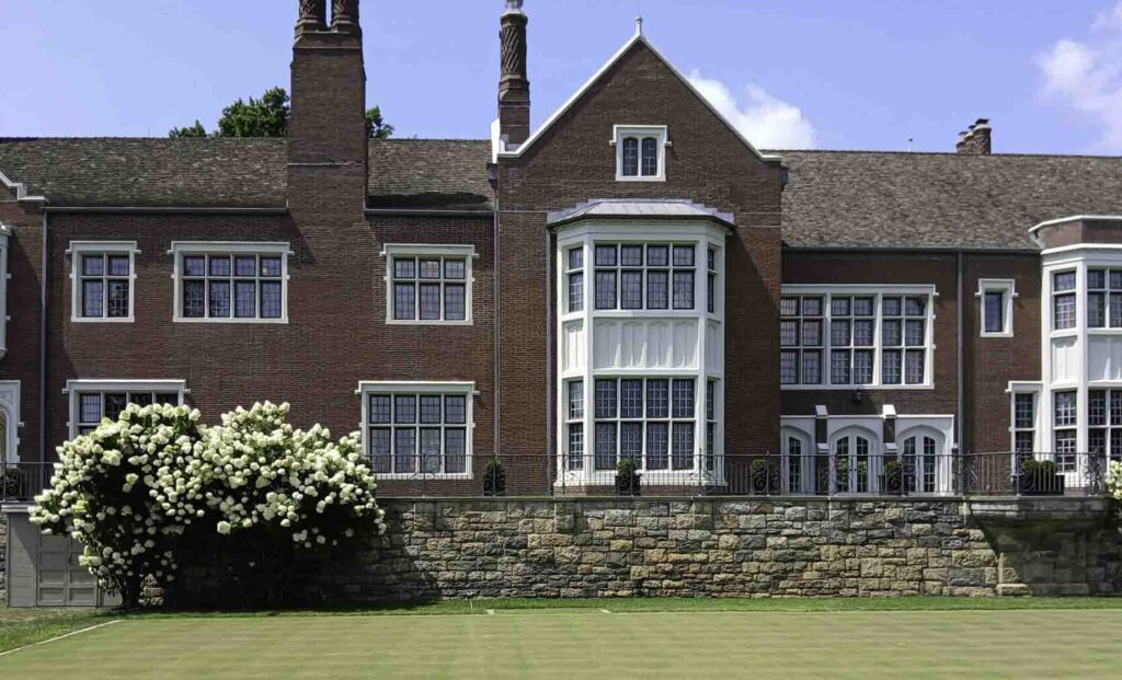 Dunnellen Hall was built between 1916 and 1918 as one of the town’s largest dwellings, originally with 28 rooms. It was commissioned by Daniel Greg Reid, the tin-plate magnate, as a gift for his daughter, Rhea Reid Topping. Architect William Tubby designed it in the Jacobethan style, a rare variant of the Tudor style featuring masonry walls and parapeted walls and gables. The structure has been home to several notable residents who have extensively reconfigured many of the original features and layout.