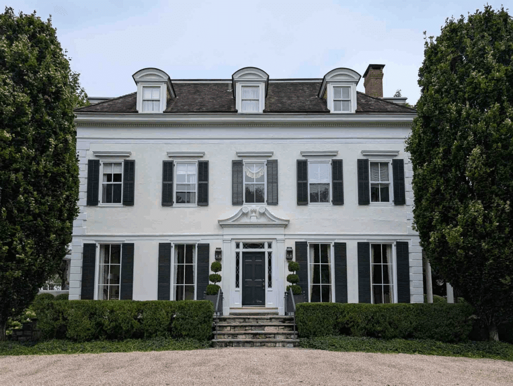 The Nathan R. Allen House consists of a series of connected one-and-two story wings focusing on the central section’s symmetrical façade. The elaborate, segmented, arched front entrance shelters a corresponding entry porch with a vaulted ceiling. It was constructed just before the nation’s entry into World War II, for Nathan R. Allen who operated his own investment business. Later, it was the long-time residence of Thomas J. Watson, Jr. President of IBM.